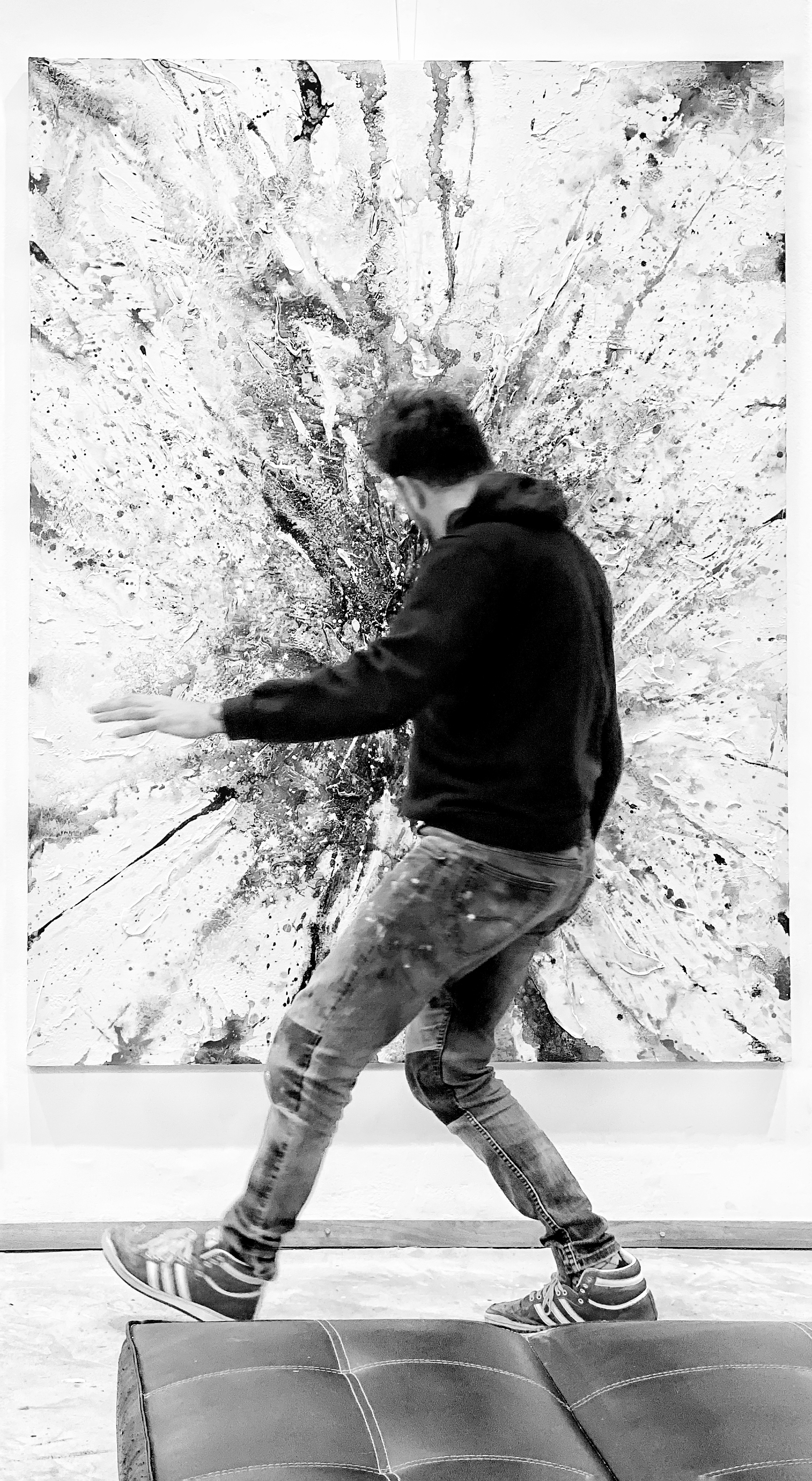 Esta base le permite hoy trabajar con un alto grado de precisión, aplicando el uso del aire y el pigmento en capas de texturas controladas que interactúan dinámicamente con la luz, el movimiento y la percepción.